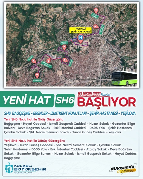 İzmit Orhan Mahallesi-Turgut Mah.- Erenler Mah. – Cedit Mah. – 28 Haziran Mahallerinden Şehir Hastanesi ve Yeşilova bölgesine erişimin sağlanması için hizmet verilecek. Ayrıca SH6 Hattı ile 28 Haziran, Cedit, Erenler Mahallelerinde ikamet eden öğrencilerin, Orhan Mahallesinde bulunan Tevfik Sena Arda Lisesine tek vasıta ile toplu ulaşım hizmeti sağlanacak. SH6 Hat araçları ile 43-44-51-53 no.lu Hat araçları arasında ücretsiz aktarmalı toplu taşıma hizmeti verilecek.