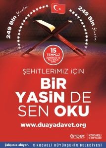 Büyükşehir Belediyesi’nin www.duayadavet.org internet sitesi ile 249 demokrasi şehidimiz ve tüm şehitlerimiz için hedeflenen 249 bin Yasin-i Şeriflerin sayısı şimdiden 300 bini buldu. Kocaelililerin katılımıyla milletimizin ezelden gelen ‘’bir ölür, bin diriliriz’’ anlayışından yola çıkarak her şehidimiz için bin adet olmak üzere Yasin-i Şerifler okunmak için yola çıkılmıştı. Vatandaşların yoğun ilgi gösterdiği anlamlı davete her gün yüzlerce Yasin okumak için siteden kayıt alınmaya devam ediliyor.