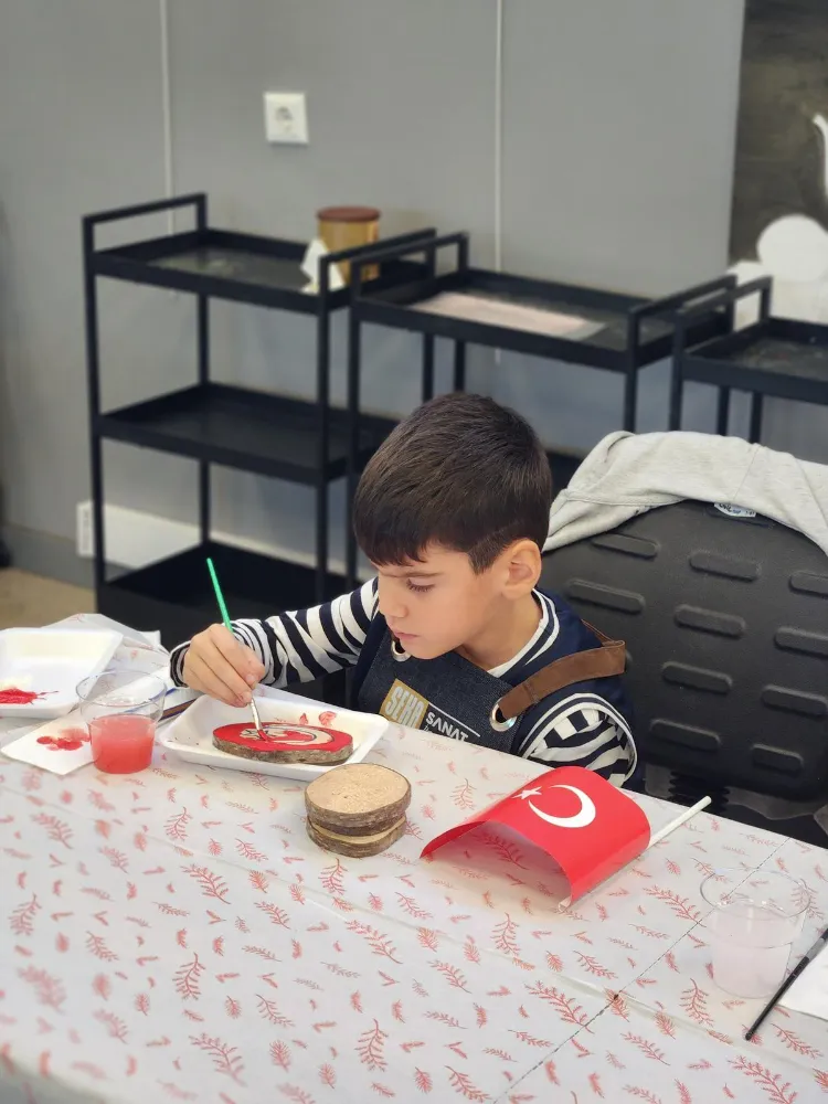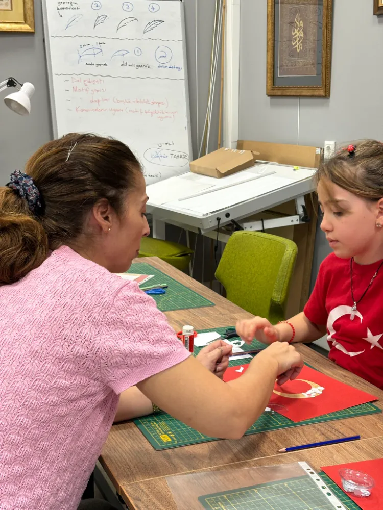 Cumhuriyet temalı ilk etkinlikler, Katı’ı ve Tezhip Atölyeleri tarafından gerçekleştirildi. 8-12 yaş aralığındaki çocukların katıldığı atölyelerde, Türk Bayrağı motifleri işlendi. “Bayrağımız Çiçek Açsın” ismini taşıyan Katı’ı Atölyesi’nde, Osmanlı döneminde önemli eserler verilen kâğıt oymacılığı sanatı üzerine bilgilendirme yapıldı. Ardından çocuklar, ay yıldızlı bayrağımızın motiflerini işleyerek kendi eserlerini hazırladı. Eğitmenlerin rehberliğinde yürütülen uygulamada çocuklar, hem el becerilerini geliştirdi hem de Cumhuriyet sevgisini sanata dönüştürmenin gururunu yaşadı. Benzer şekilde Tezhip Atölyesi’nde de Türk Bayrağı teması işlendi ve çocuklar zarif desenlerle süslenmiş eserler ortaya koydu.