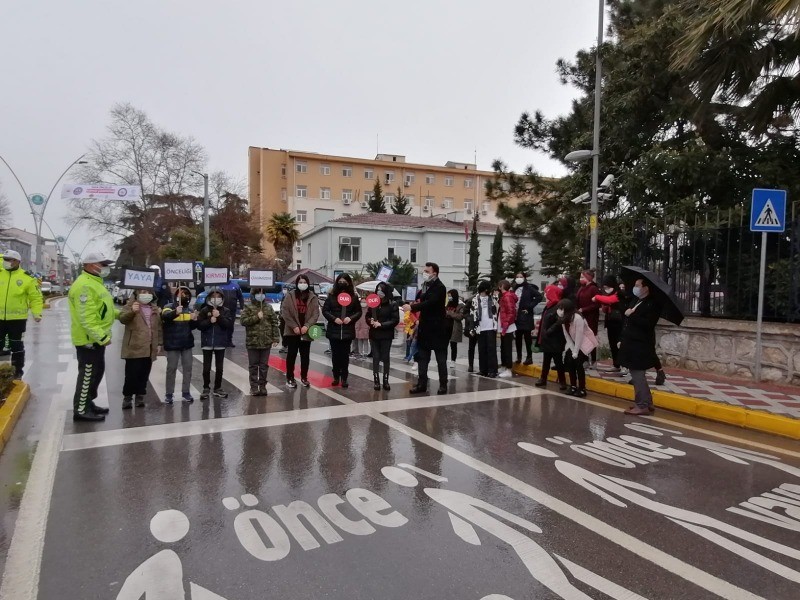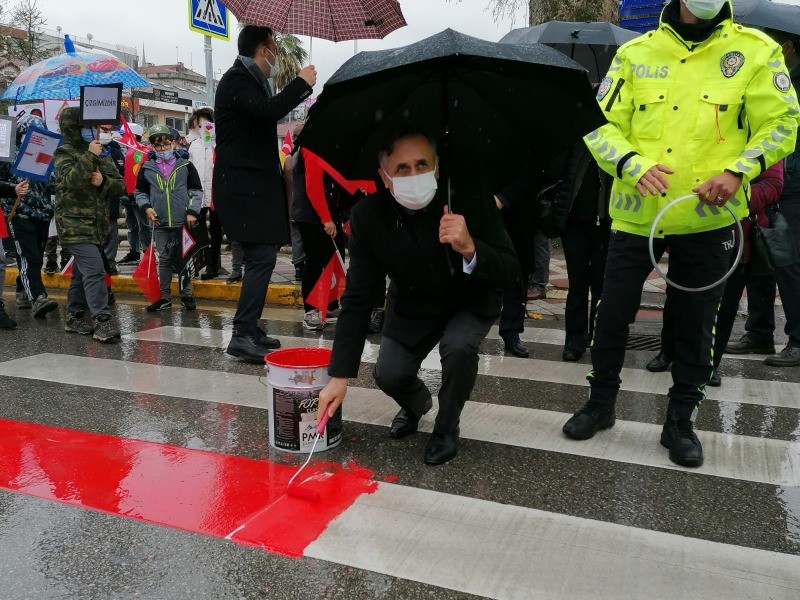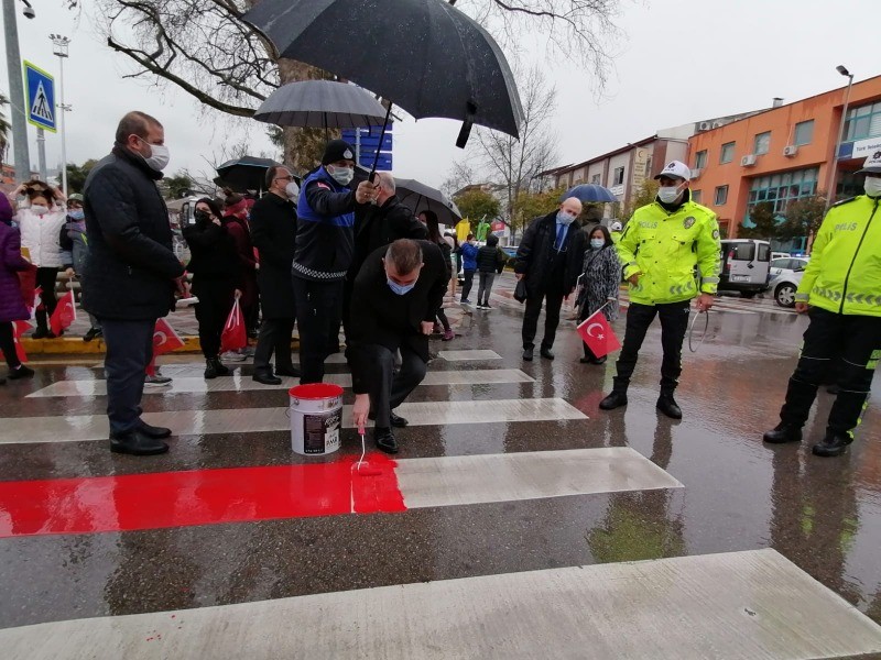 Düzenlene etkinlik hakkında açıklama yapan Gölcük Kaymakamı Cengiz Karabulut konuşmasında, “ 2018 yılında Karayolları Trafik Kanunu’nda yapılan bir değişiklikle okul önlerindeki yaya geçitleri, kavşakla,r trafik işaret ile görevlisi olmayan yerlerde yeni bir düzenleme yapılarak bu alanlardaki trafik önceliği yayalara verilmiştir. Biliyorsunuz trafik kazalarının önemli bir kısmı insan hatasından kaynaklanmaktadır. Bunun bertaraf edilmesi için yaya önceliği baz alınarak 3 yıldır bakanlığımızın sürdürdüğü bir proje var. Bu proje kapsamında da 2021 yılında da “yaya önceliği kırmızı çizgimizdir” mottasıyla bakanlığımız bir çalışma başlattı. Bugün bütün Türkiye’de, bütün illerde ve ilçelerde saat 12:00 ile 15:00 arasında farkındalık yaratmak, kamuoyunu bilinçlendirmek amacıyla etkinlikler tertipleniyor. Bu etkinlikler içerisinde ilçemizin tamamına yakını tamamı hatta kırmızı çizgide farkındalık yaratmak amacıyla çizildi. Bugün biz de sembolik de olsa yaya çizgimizi kırmızıya boyayacağız. Biliyorsunuz değerli arkadaşlar sürücüler aynı zamanda birer yayadırlar. Dolayısıyla sürücü arkadaşlarımıza buradan sesleniyoruz. Zaten bir saat önce sürücü olan bir saat sonra yaya olabiliyor. Dolayısıyla yayalarımızın can güvenliğini temin açısından bu belirtilen mevzuat değişikliğindeki kurallara kendilerinden uymalarını bekliyoruz, istiyoruz. Bu oldukça önemli bir uygulama. 3 yıldır emniyet güçlerimiz, jandarmamız, kolluk birimlerimiz takip ediyor. buna bütün vatandaşlarımızın katkı sağlamasını canı gönülden arzu ediyoruz. Çocuklarımızda bu konuda anne babalarını sürücüleri uyarıcı bir misyon üstleniyorlar. Onların eğitimi de bu anlamda bizim için oldukça önemli. Bu anlamda bütün sürücülerimizi duyarlı olmaya davet ediyoruz” dedi.