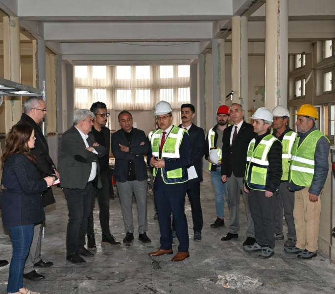 Bu bağlamda Mart ayında ihale süreci tamamlanan ve restore sonrası gençlik merkezi olarak hizmet verecek olan tarihi binayı basın mensuplarıyla birlikte gezen Vali Yavuz, firma adına şantiye şefi/firma yetkilisi Recep Tokalak’tan bilgiler alarak incelemelerde bulundu.