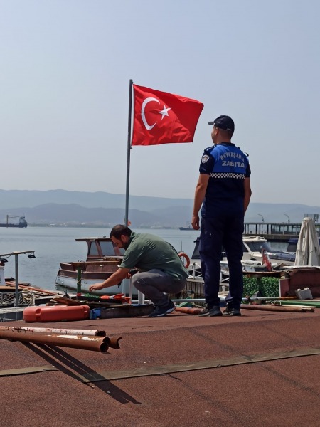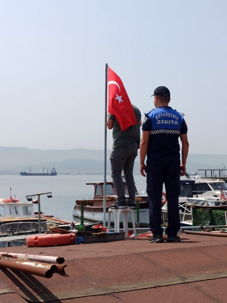 Büyükşehir Zabıtası, İzmit’te eski balık halinin bulunduğu alanda asılı bulunan bayrağın renklerinin solduğunu görünce yenisiyle değiştirdi