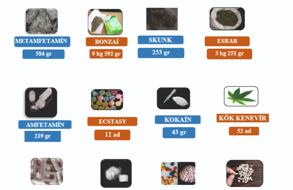 Emniyet operasyonlarında ele geçirilenler ise dikkat çekti: 1 kilo 666 gram esrar, 432 gram kokain, 409 adet ecstasy. Çok miktarda bonzai, metamfetamin ve sentetik ecza. Uyuşturucu ticaretinden elde edildiği değerlendirilen 61 bin 665 TL nakit para ve 5 adet hassas terazi.